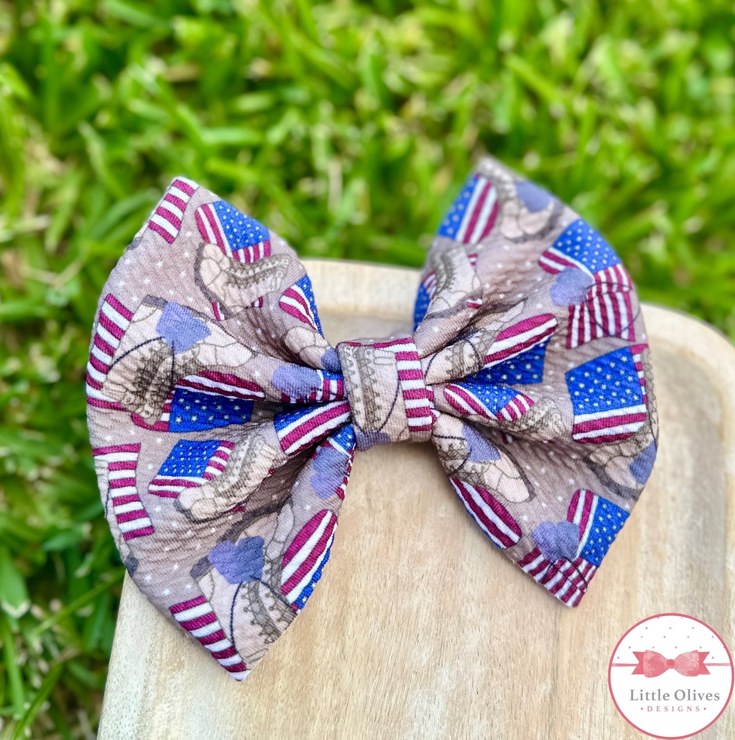 All bows are made with high quality bullet Liverpool or rib knit fabric. Super soft and stretchy materials.